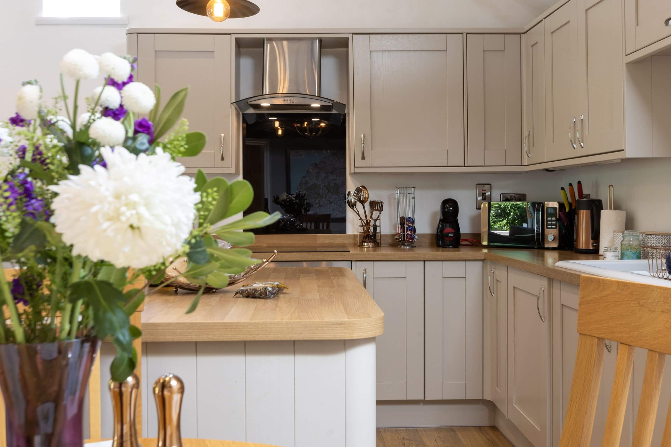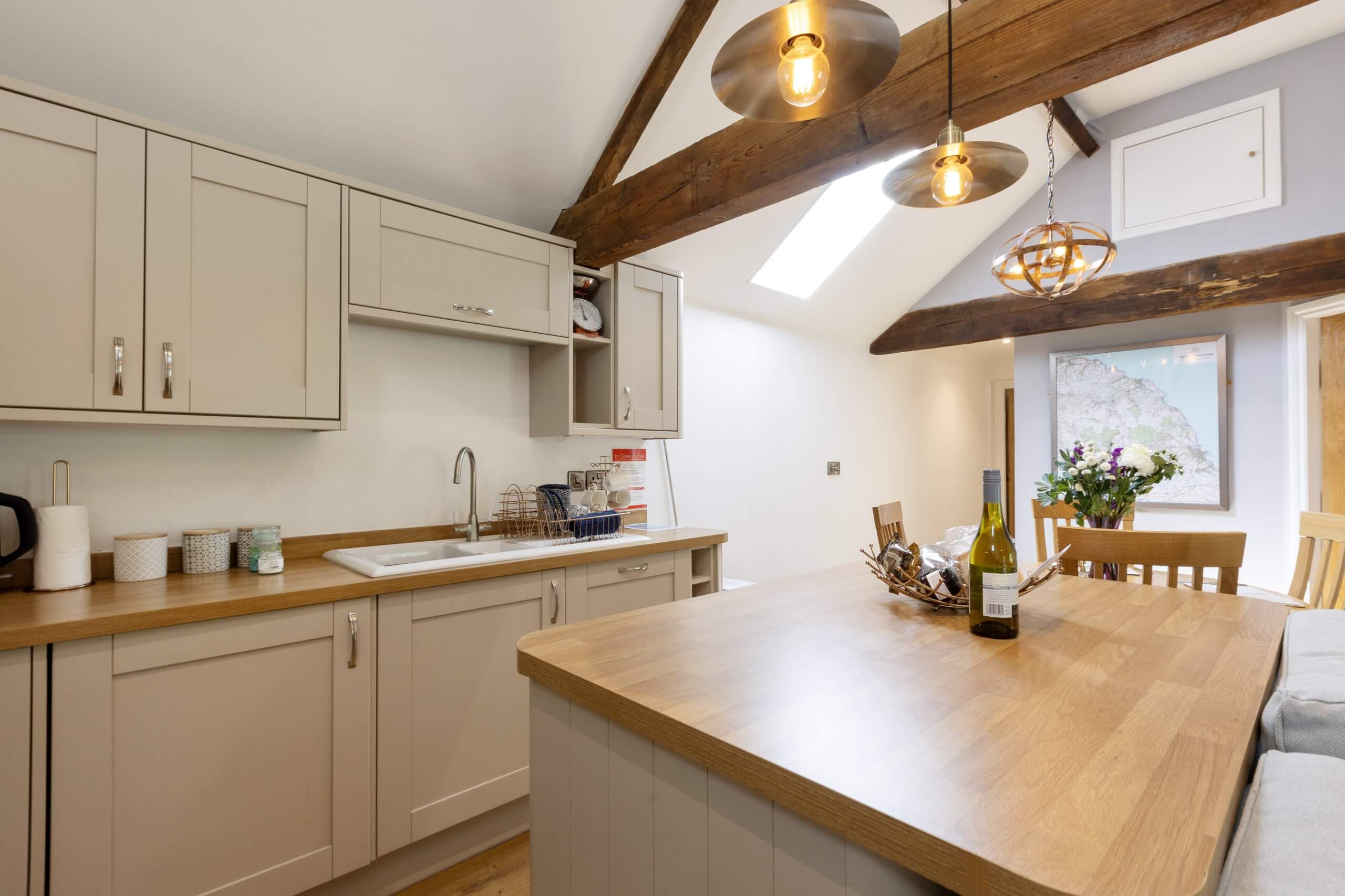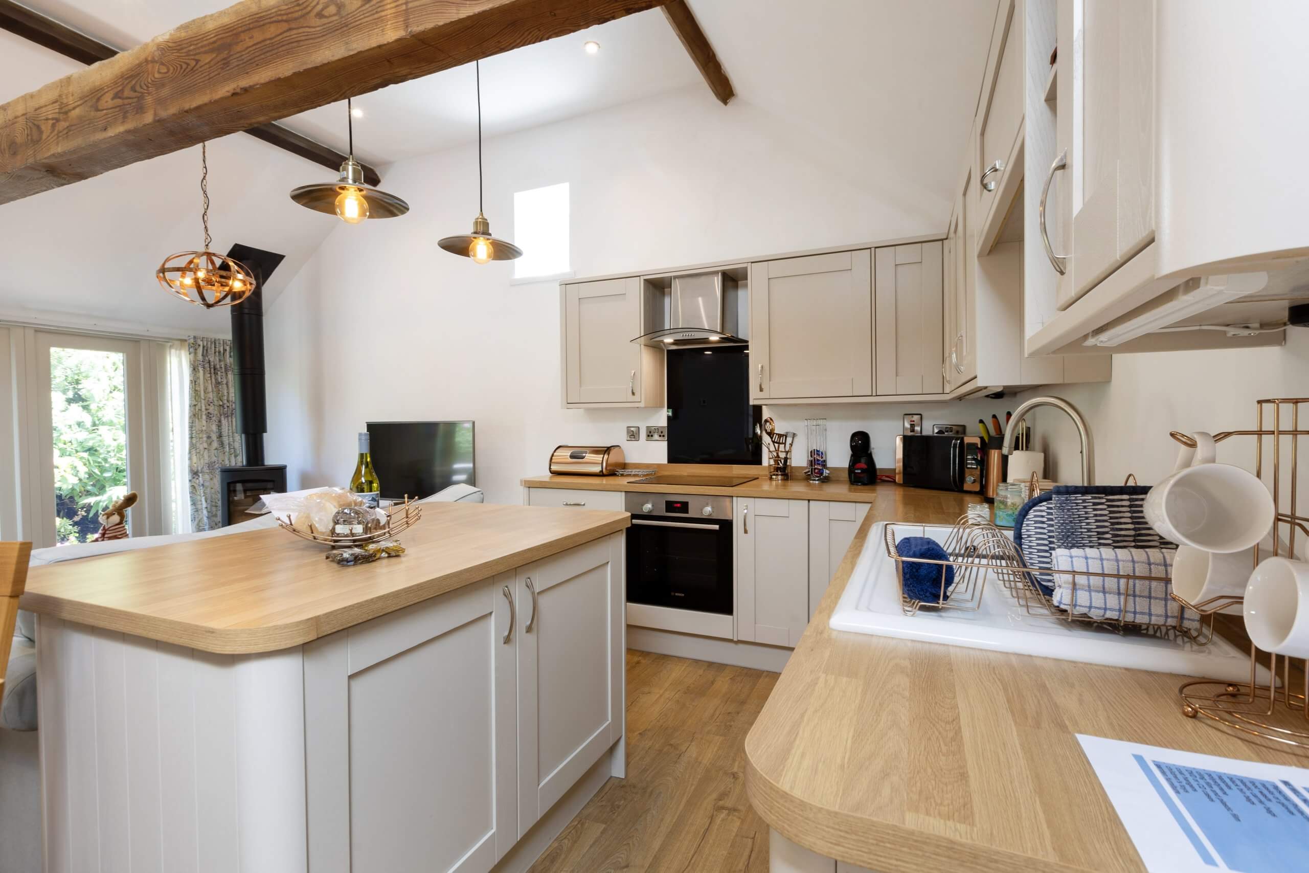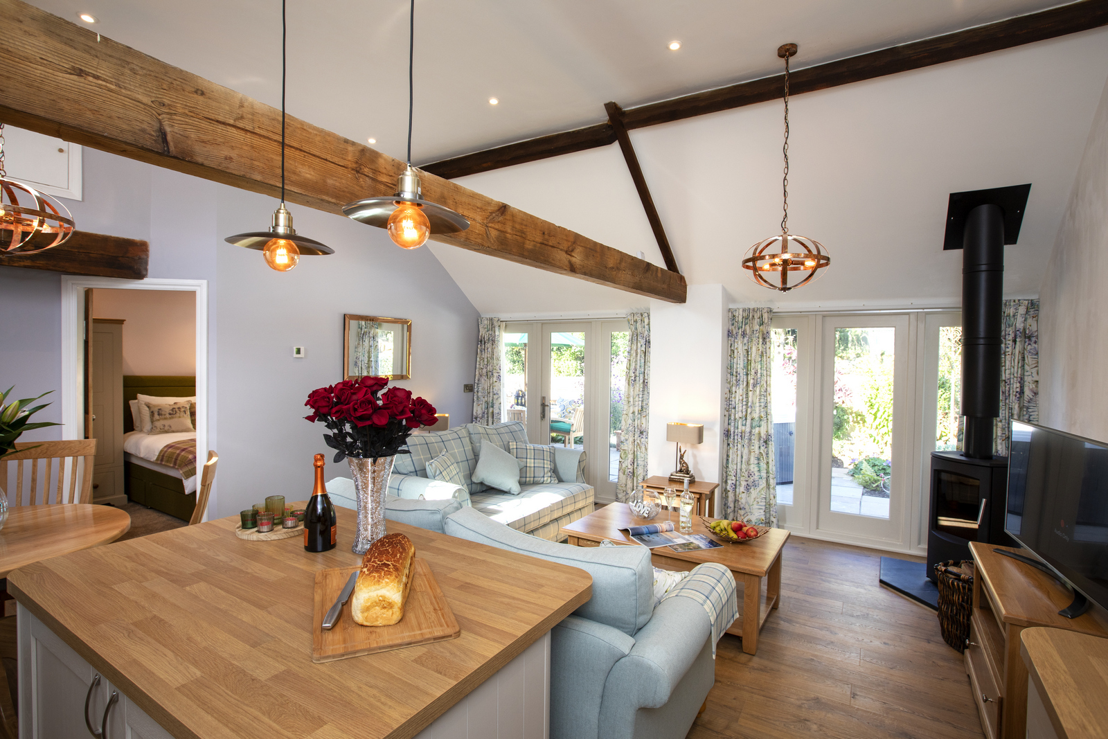 Set across a single level, there are 2 en-suite bedrooms (one king-sized and one twin) and an open-plan kitchen, living and dining space, complete with log burner, wooden surfaces and adjustable mood lighting. This is also one of our pet-friendly properties and we can accommodate 1 large – medium or 2 small canine companions. Due to the layout, no exceptions can be made.